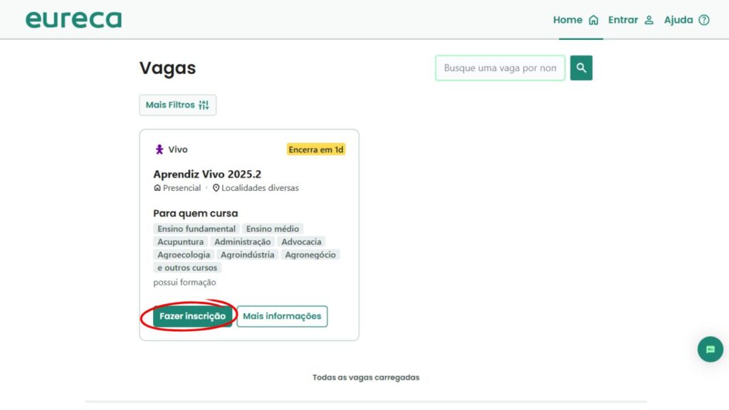 3️⃣ Na plataforma da Eureca, localize a vaga com o nome “Aprendiz Vivo“.